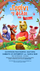 Το αγαπημένο αρκουδάκι των παιδιών και η παρέα του ζωντανεύουν στη σκηνή μέσα από τη νέα παραγωγή της Παιδικής Σκηνής Θεσσαλονίκης, «Ο Γουίνι και οι φίλοι του σε νέες περιπέτειες!», μια παράσταση γεμάτη χιούμορ, μουσική, φαντασία και μπόλικη…τιγροσύνη, που αναδεικνύει τη σημασία του να πιστεύεις στον εαυτό σου, να σηκώνεσαι κάθε φορά που πέφτεις και να μη χάνεις ποτέ μα ποτέ τη χαρά του παιχνιδιού! Έρχεται στο Ολύμπιον Πολυχώρος, για δυο μόνο παραστάσεις στις 25 Οκτωβρίου στις 16:00 και στις 18:00.