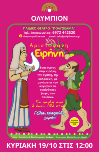 Το παιδικό θέατρο «Πολυθέαμα» παρουσιάζει τη θεατρική παράσταση ΕΙΡΗΝΗ ΤΟΥ ΑΡΙΣΤΟΦΑΝΗ, μια διαχρονική κωμωδία γεμάτη γέλιο, τραγούδι και χορό!